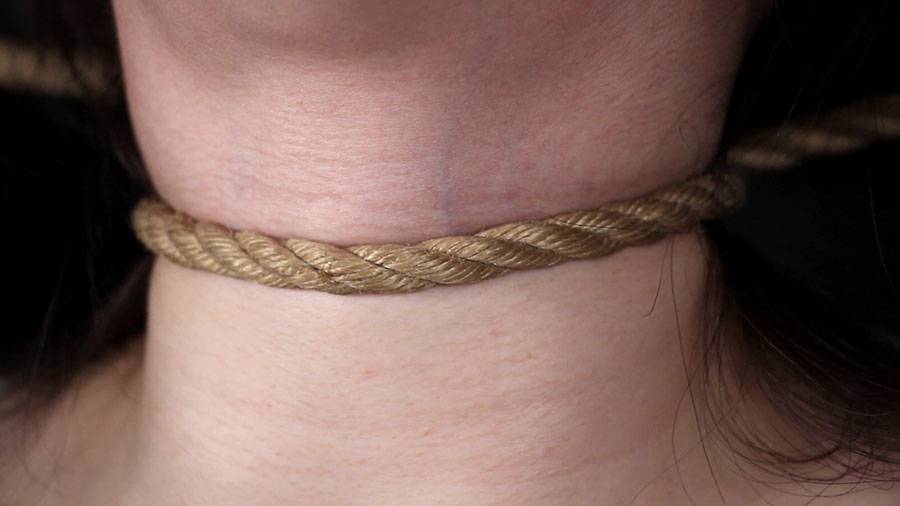 緩まないゴムチューブの首絞めに激しく苦しみ出す女の子が凄い!